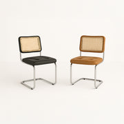 This design pairs an open-weave rattan back with a cushioned faux leather seat. Its sculptural frame adds artisanal flair to modern dining or lounge areas.