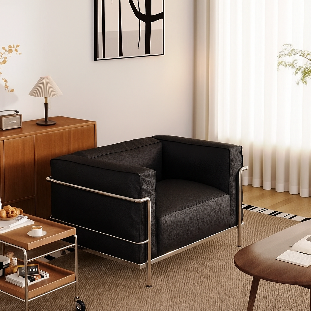 A minimalist design framed in slim stainless steel, featuring rich genuine leather cushions and a down-infused interior for comfort. Its compact, angular shape and polished metal base reflect a refined, industrial-chic aesthetic
