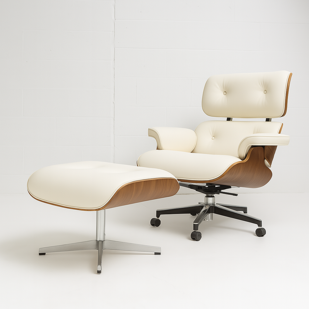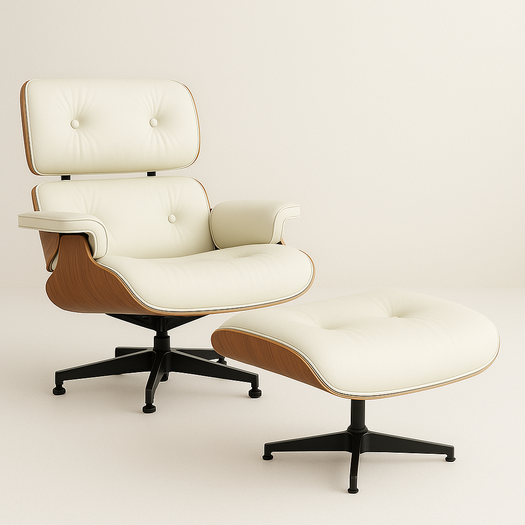 A mid-century modern pairing featuring curved wood shell and buttery leather cushioning. The ottoman completes the look—designed for long-lasting comfort and classic sophistication.